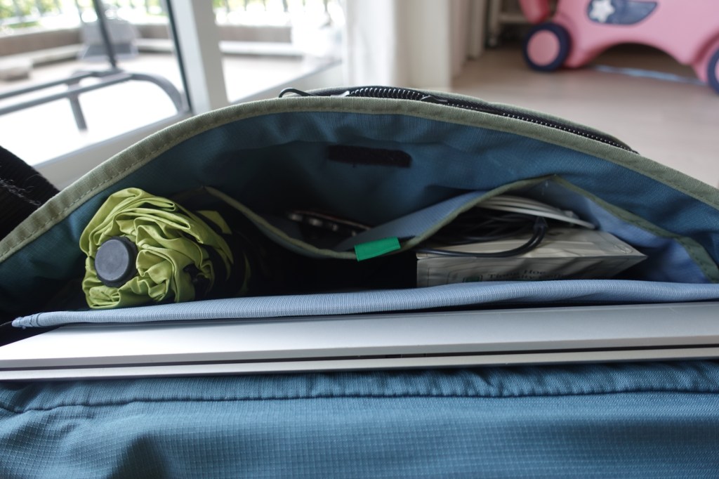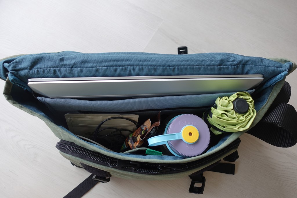 Here my daily bringalongs fit just nice. A 15″ laptop (similar to Macbook 16″), Nalgene bottle (fits only in the middle because of the width), umbrella, a small bag of coffee (to simulate how a small pouch would fit). Good nudge for me to stay minimalist.